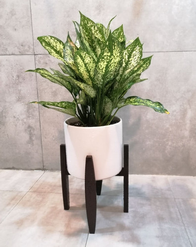 گیاه طبیعی پتوس مرمری با گلدان سرامیک و پایه چوبی