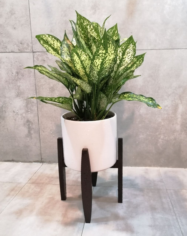 گیاه طبیعی آگلونما سفید با گلدانسرامیک و پایه چوبی