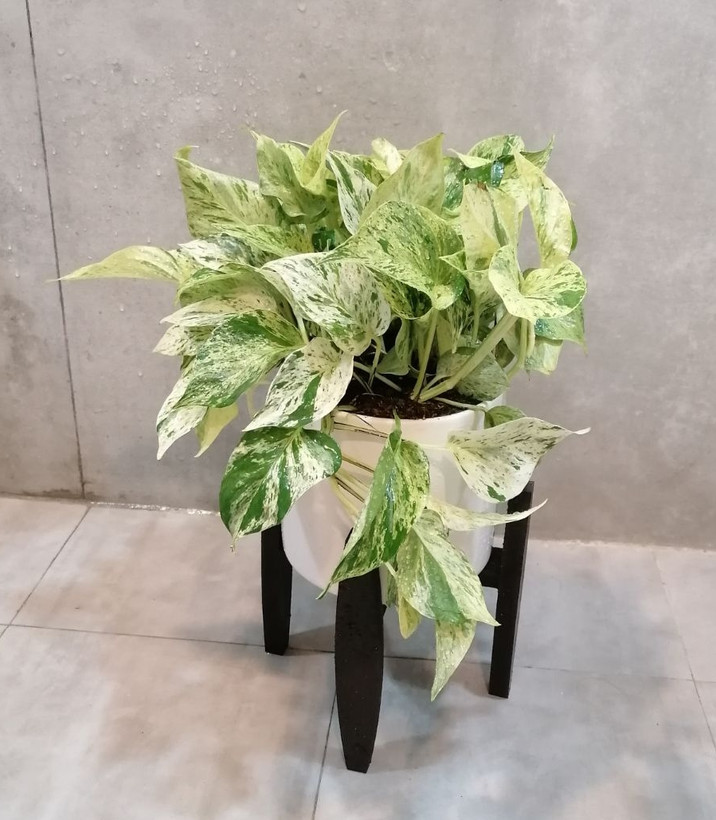 گیاه طبیعی پتوس مرمری با گلدان سرامیک و پایه چوبی
